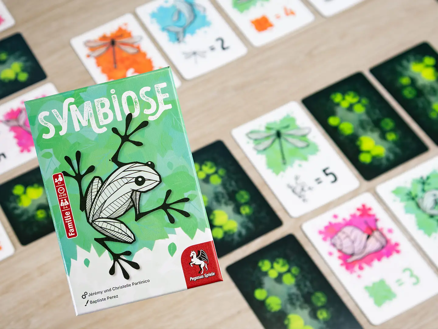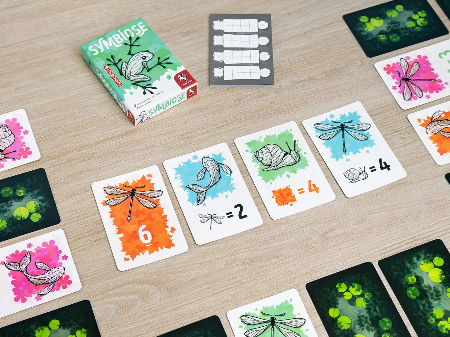 Symbiose kann auch im Duell-Modus 1 gegen 1 gespielt werden oder im Team-Modus 2 gegen 2. Außerdem ist das Teichbauspiel Teil der Spielreihe Einfach! Schnell! Clever!